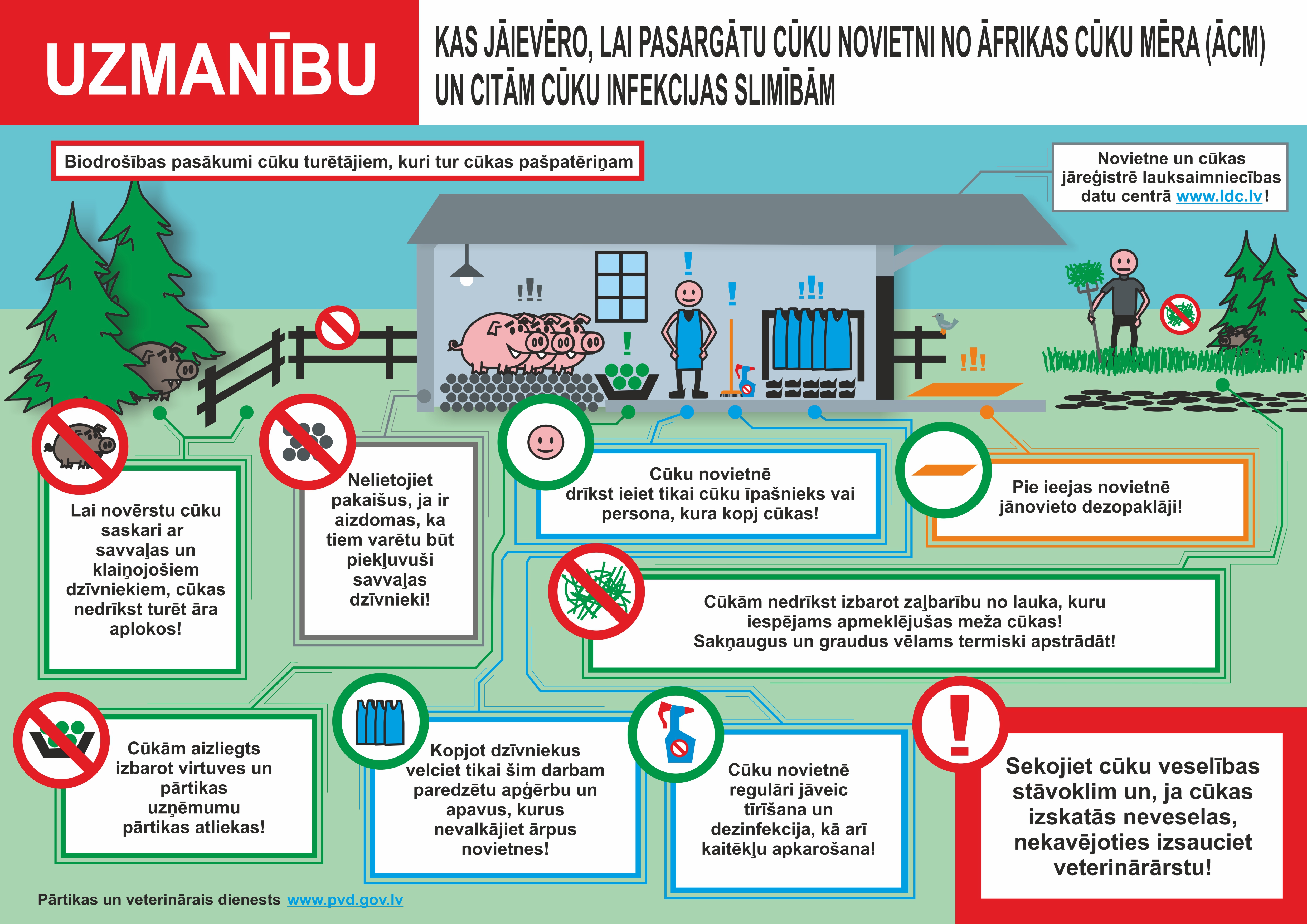 PVD aicina visus dzīvnieku īpašniekus un dzīvnieku turētājus, jo īpaši tos, kuri savā saimniecībā tur cūkas, stingri ievērot noteiktos biodrošības pasākumus, tādejādi pasargājot savus dzīvniekus no saslimšanas ar infekcijas slimībām un maksimāli samazinot infekcijas slimību izplatīšanos apkārtējā teritorijā.