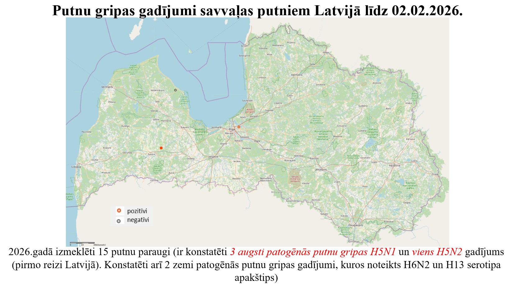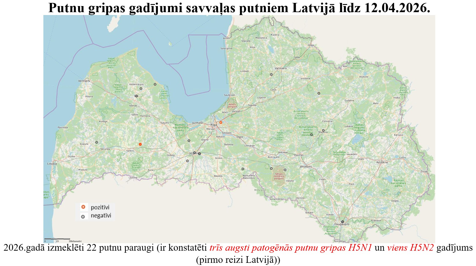 | 13.11.2025. | Dienvidkurzemes novada Durbes pagasts | 93 putni (dažādu sugu) | Augsti patogēnā putnu gripa H5N1 |